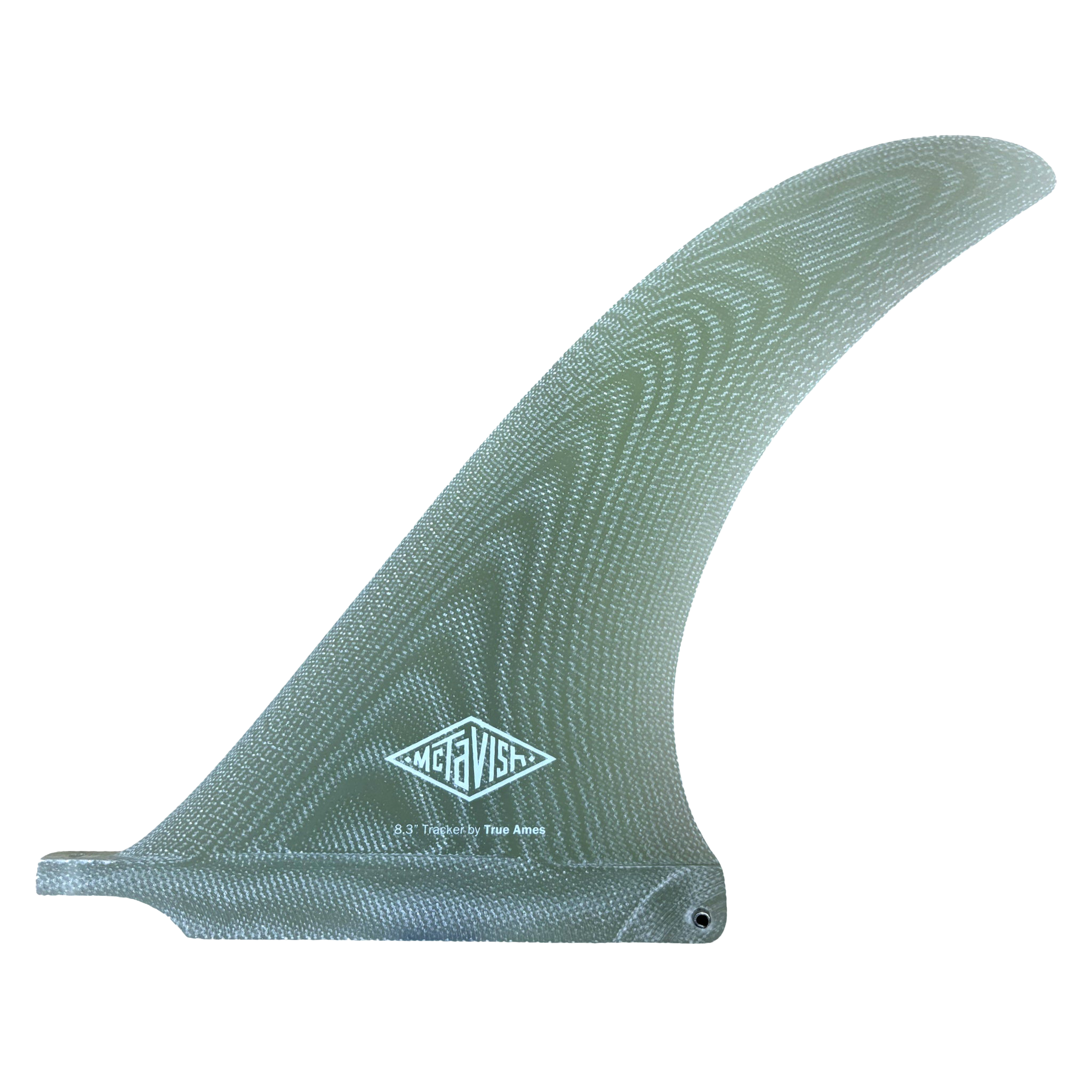 McTavish Tracker (Volan) - Single Fin, Hand-Laid Premium Volan Construction. A classic McTavish Tracker-style template updated in True Ames' Volan build, using hand-laid 44-layer panels with optimal weave orientation for dialed-in flex. The medium base and raked outline provide drive and projection for powerful, down-the-line surfing, while the Volan construction lets the fin flex from the body and spring back to center.