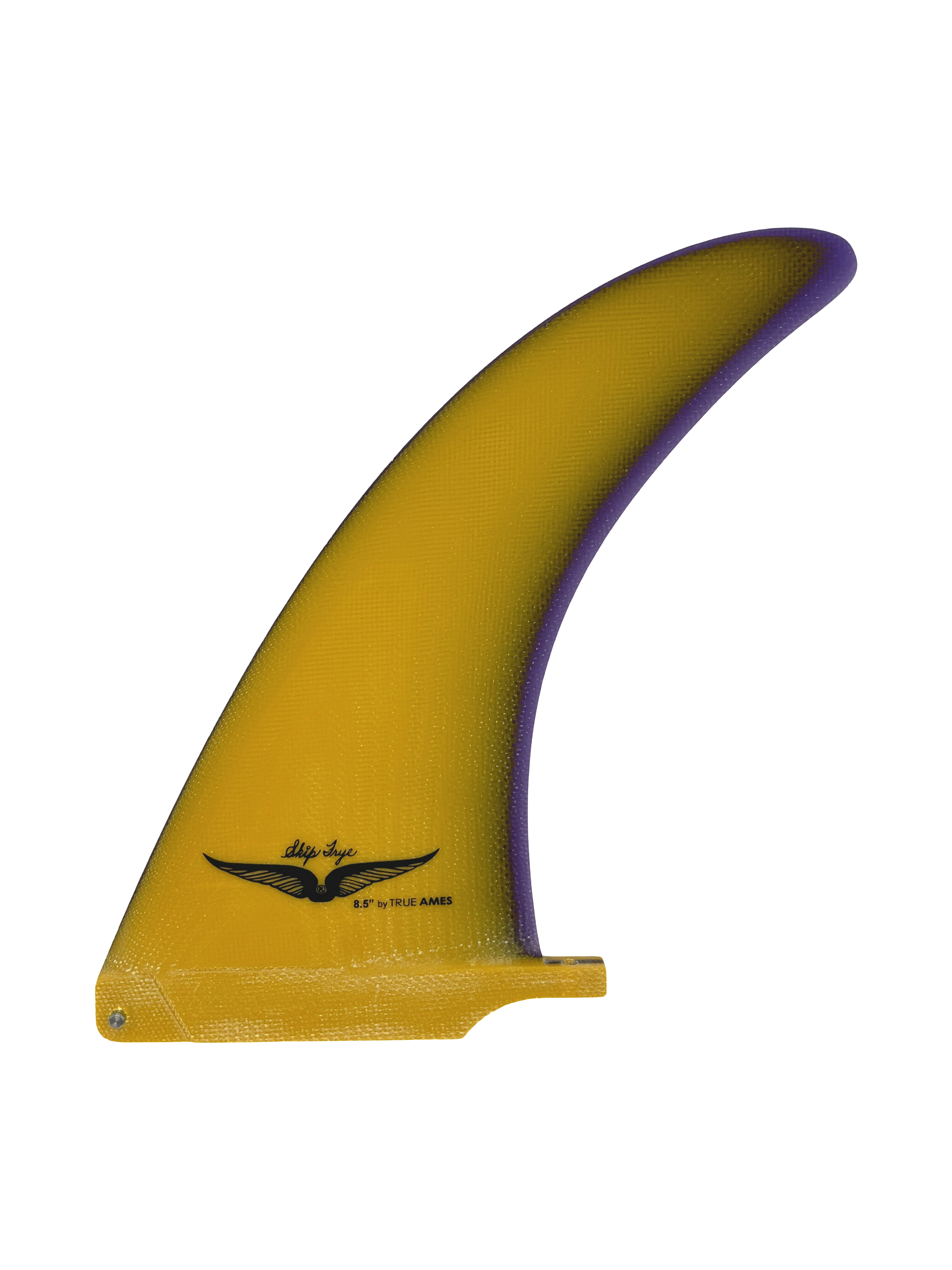 ShowTime Skip Frye - Single Fin, Solid Fiberglass, Limited Edition. A limited Lakers-inspired color-up of Skip Frye's iconic single-fin template from True Ames, built for fluid, graceful surfing on Eggs, Gliders, and thinner planing-type boards. Skip Frye is an accomplished San Diego surfer and shaper known for silky smooth style and innovative designs; this fin, devised in the mid-1970s, was developed to excel in a supporting role under his signature boards.