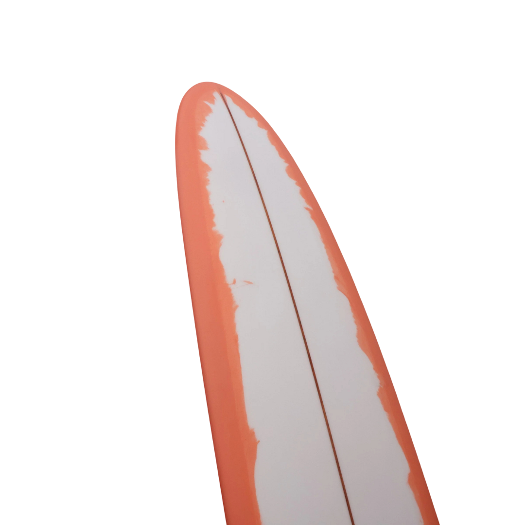 Introducing the Gato Heroi 8'0" Spacepig surfboard, a stunning blend of style and performance in vibrant coral pink. This mid-length design is crafted with a coral pink freelap deck and a clear bottom, enhanced by volan patches for durability and aesthetic appeal.