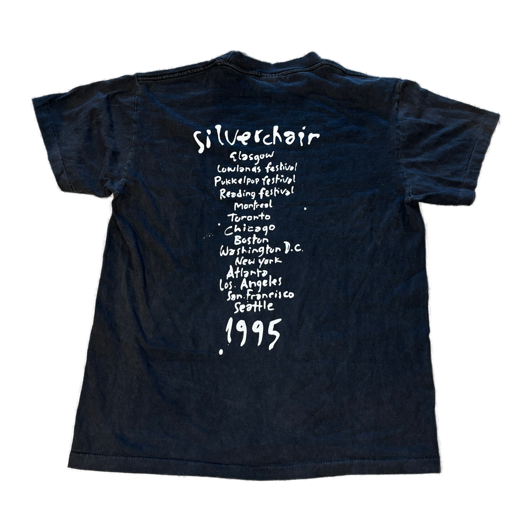 Vintage Silverchair Freakshow t-shirt from the 1995 USA Tour. Front features the iconic pig man/clown artwork with "Silverchair" in white script. Back lists USA tour dates and cities with "1995" and "Silverchair" text. Two-sided print.
