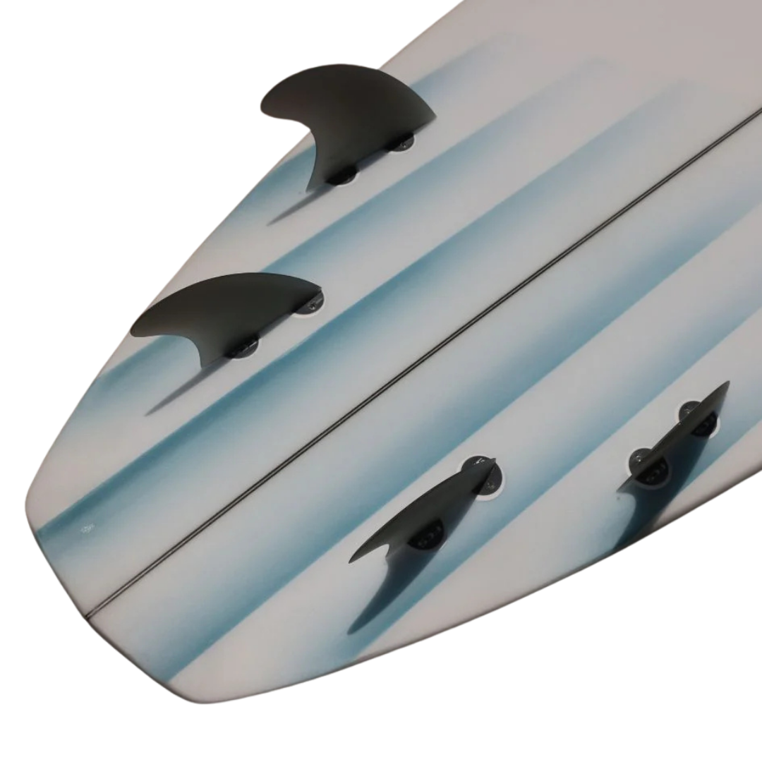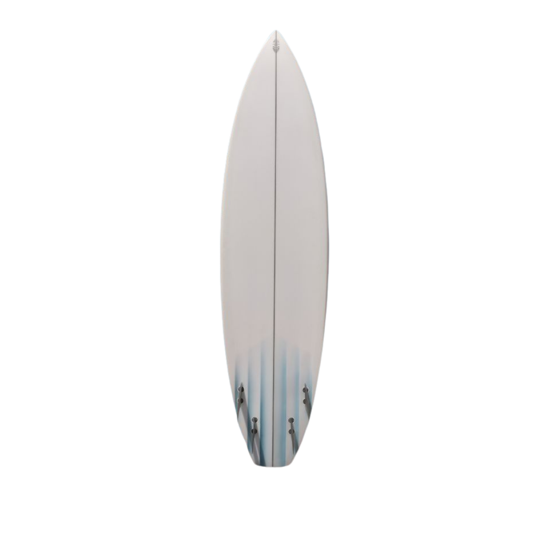 This model is a great step up inspired by the flat deck Shortboards before they got real chippy, with a hint of modern rails and bottoms for ease of ride. Just enough rocker for a fluid ride and lots of drive. Subtle beak nose and deep 6 channels.