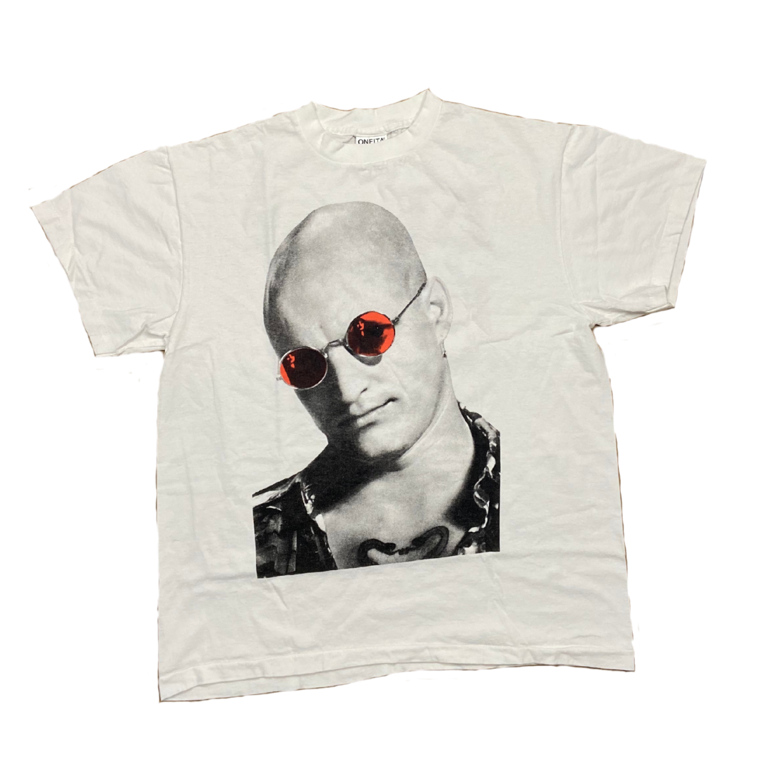 Features Mickey Knox (Woody Harrelson) portrait with shaved head and red-tinted sunglasses. Snake tattoo visible on chest. ONEITA tag - single stitch construction.